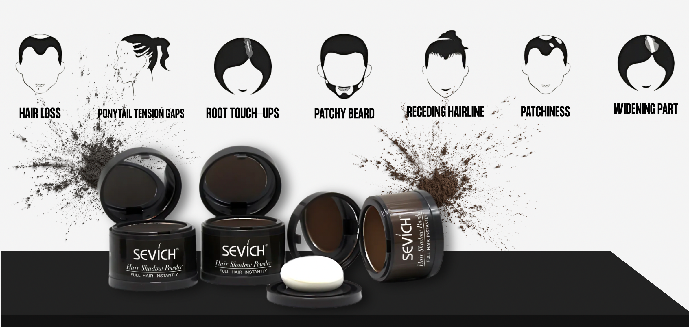A: Yes! Tinterra™ is perfect for filling in thinning areas, patchy spots, or even mild baldness to create the illusion of fuller, thicker hair. The micro-powder clings to both hair and scalp to reduce contrast between skin and hair, which visually enhances density. While it’s not a cure for hair loss, it’s an excellent cosmetic solution for boosting confidence and improving hairline appearance instantly.